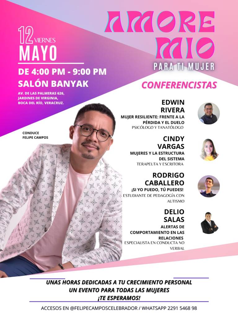 Veracruz, Ver.- El próximo viernes 12 de mayo se llevará a cabo el ciclo de conferencias Amore Mío organizado por el empresario Felipe Campos, quién también será el maestro de ceremonias del evento dedicado a las mujeres.