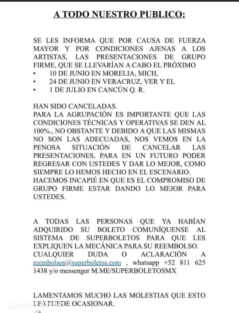 El concierto que Grupo Firme ofrecería el próximo 24 de junio en Veracruz ha sido oficialmente CANCELADO.