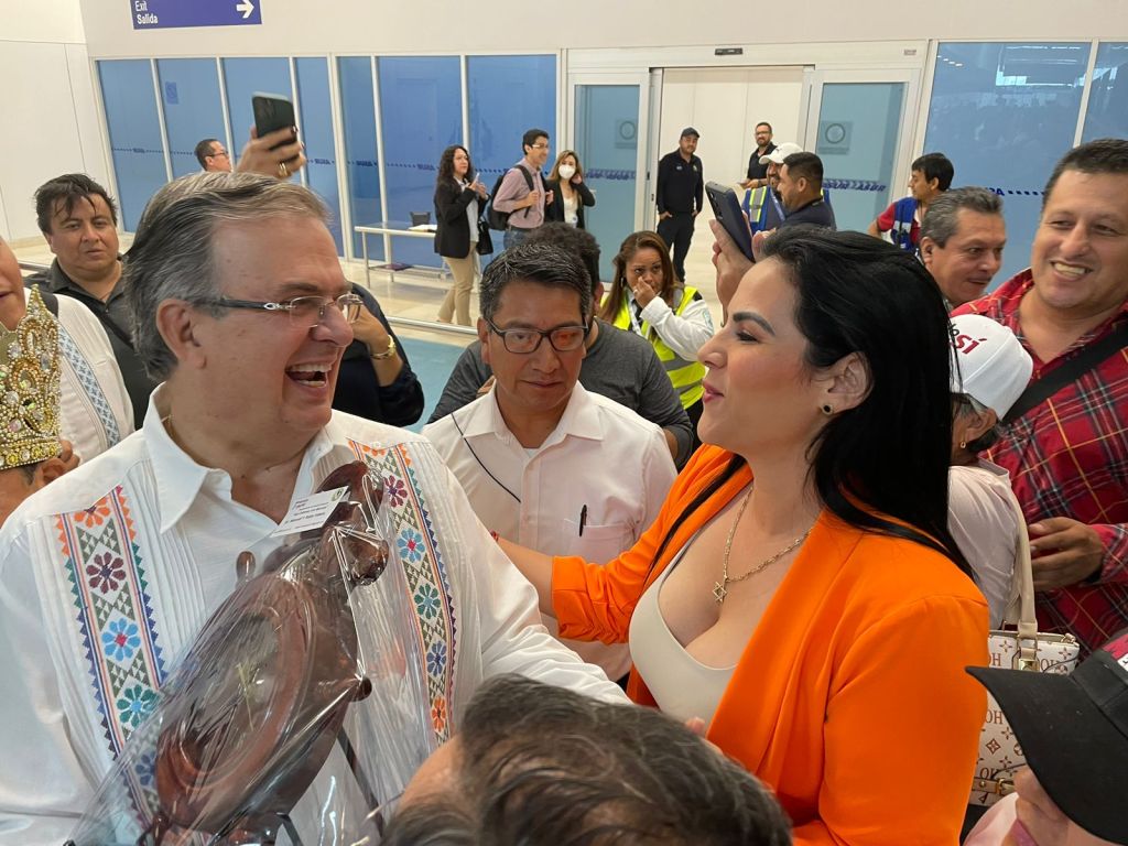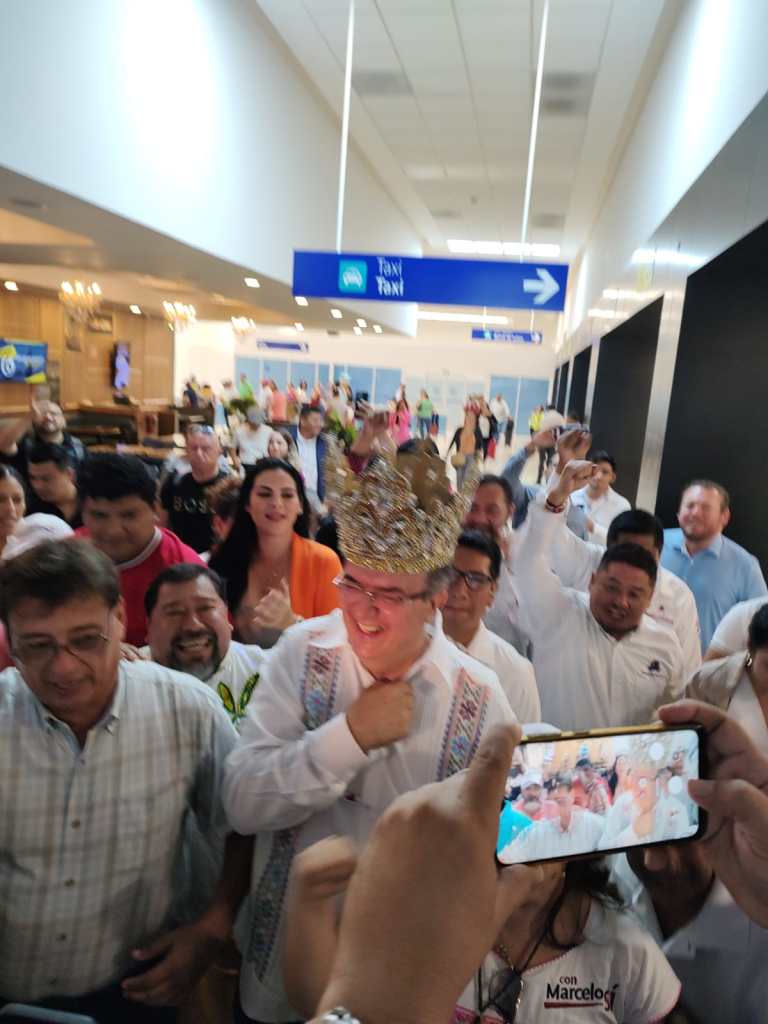 Veracruz, Ver.- En el arribo del ex canciller, Marcelo Ebrard Casoubón al aeropuerto de Veracruz la mañana de este jueves, ex Reyes del Carnaval coronaron al precandidato de Morena a la presidencia de la república.