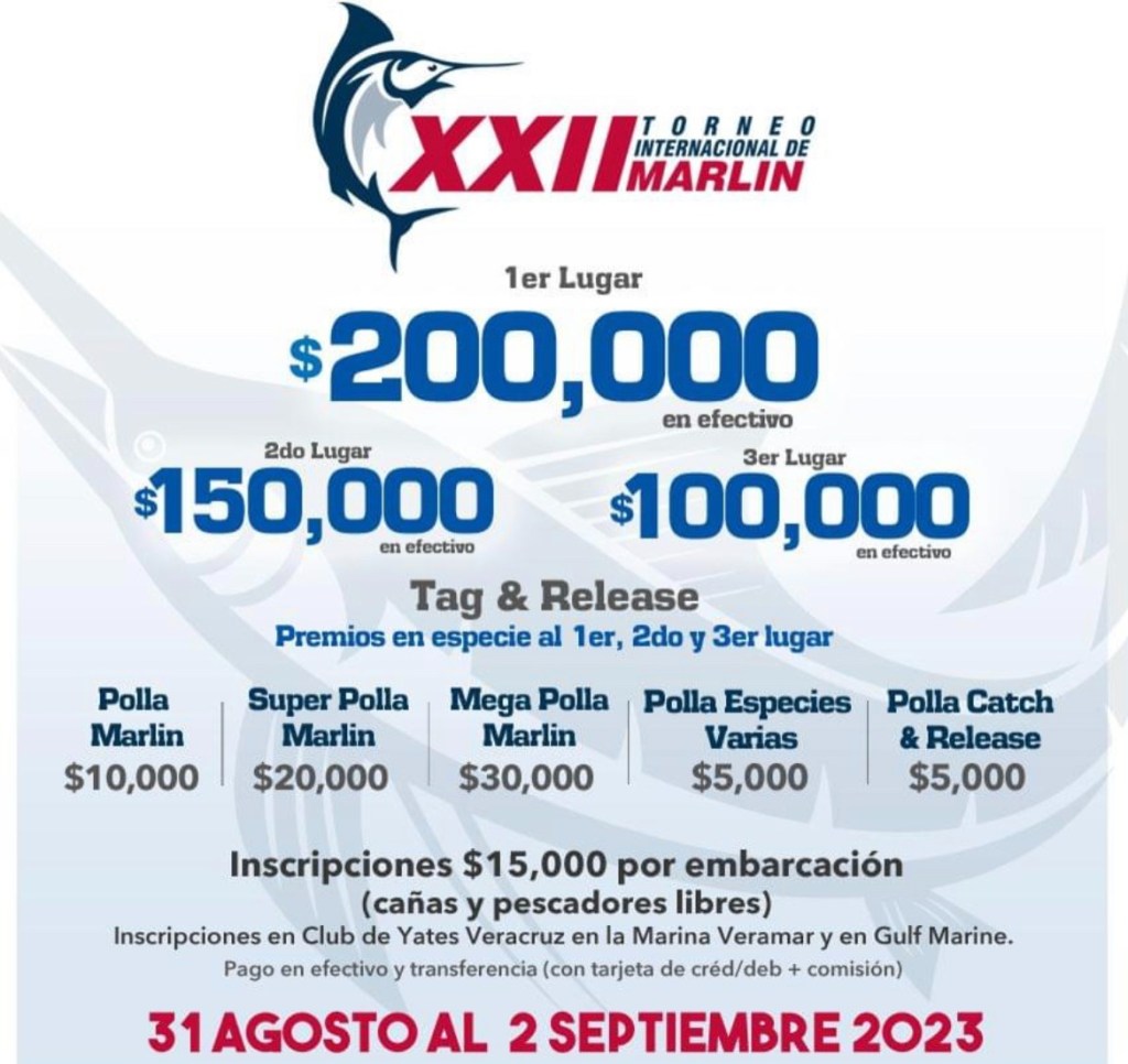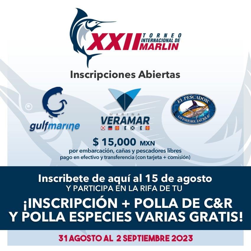 Las inscripciones para participar en la edición #22 del Torneo Internacional del Marlín están abiertas y disponibles en las instalaciones del Club de Yates Veracruz, en Marina Veramar, en Gulf Marine y en la tienda El pescador”, informó Chedraui Bolado.