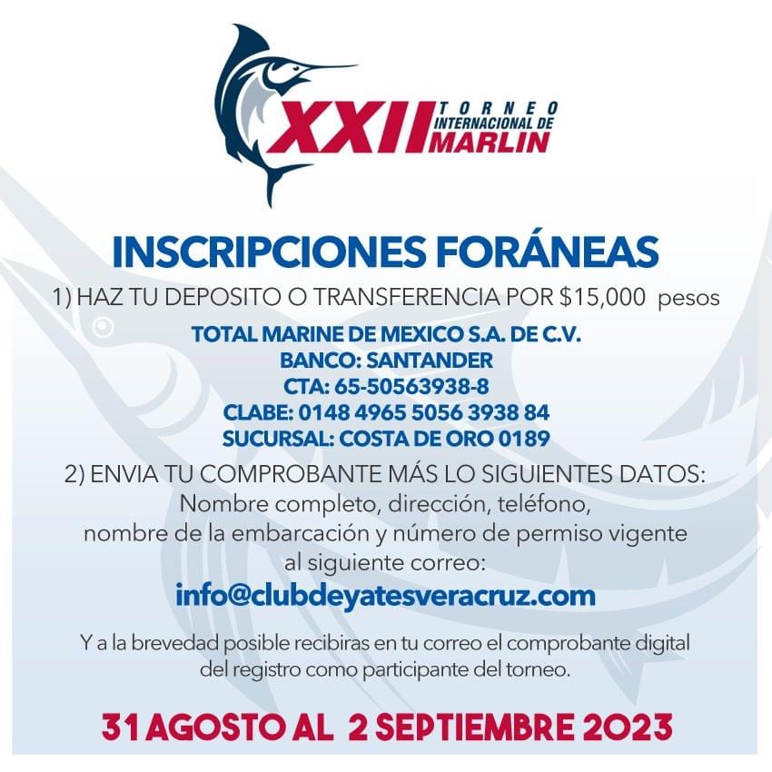 Para los pescadores deportivos que radiquen fuera de Veracruz y desean competir en el torneo, podrán inscribirse vía depósito o transferencia bancaria, posterior a ello deberán enviar su comprobante vía email a info@clubdeyatesveracruz.com