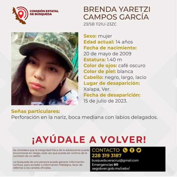 Brenda Yaretzi Campos García, ella también tiene 14 años de edad y el reporte es que desapareció el sábado 15 de julio; estatura es de un metro con 40 centímetros; color de ojos, café oscuros; color de piel blanca; cabello, largo, negro y lacio. Lugar de desaparición: ciudad de Xalapa, Veracruz. Las señas particulares: perforación en la nariz, boca mediana con labios delgados. La ficha es 23/SB 1121U-23ZC.