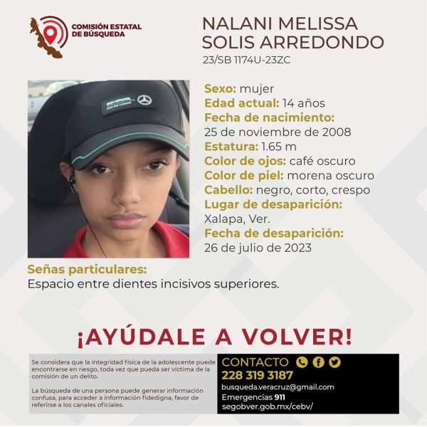 Nalani Melissa Solís Arredondo el reporte de la desaparición es con fecha del miércoles 26 de julio. La ficha de la Comisión Estatal de Búsqueda de Veracruz detalla que tiene 14 años de edad.,tiene una estatura de 1 metro con 65 centímetros; color de ojos, café oscuro; color de piel, moreno oscuro; cabello, negro, corto y crespo. Lugar de desaparición ciudad de Xalapa, Veracruz. Entre las señas particulares: espacio entre dientes incisivos superiores, refiere la ficha 23/SB 1174U-23ZC.