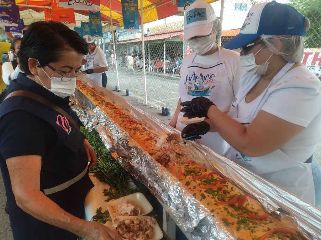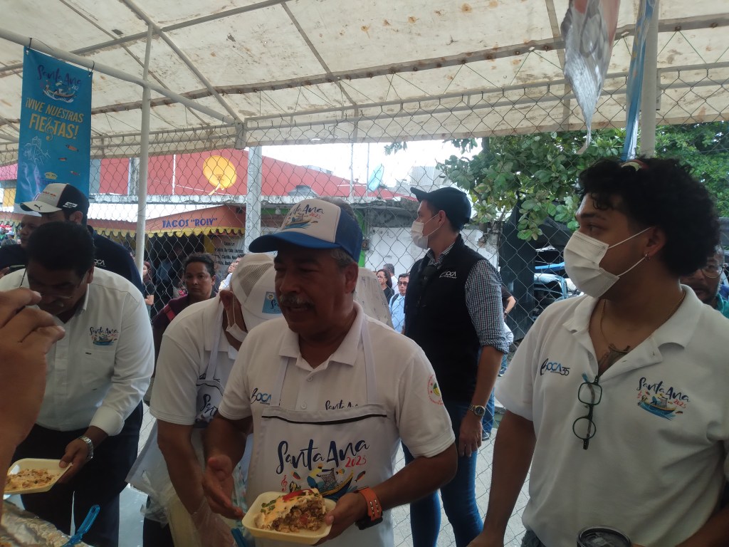 El alcalde boqueño Juan Manuel Unánue Abascal, ediles y directores del municipio junto la corte real de Santa Ana 2023 probaron con los miles de asistentes el suculento platillo que realizaron los restauranteros de la zona de Boca del Río.