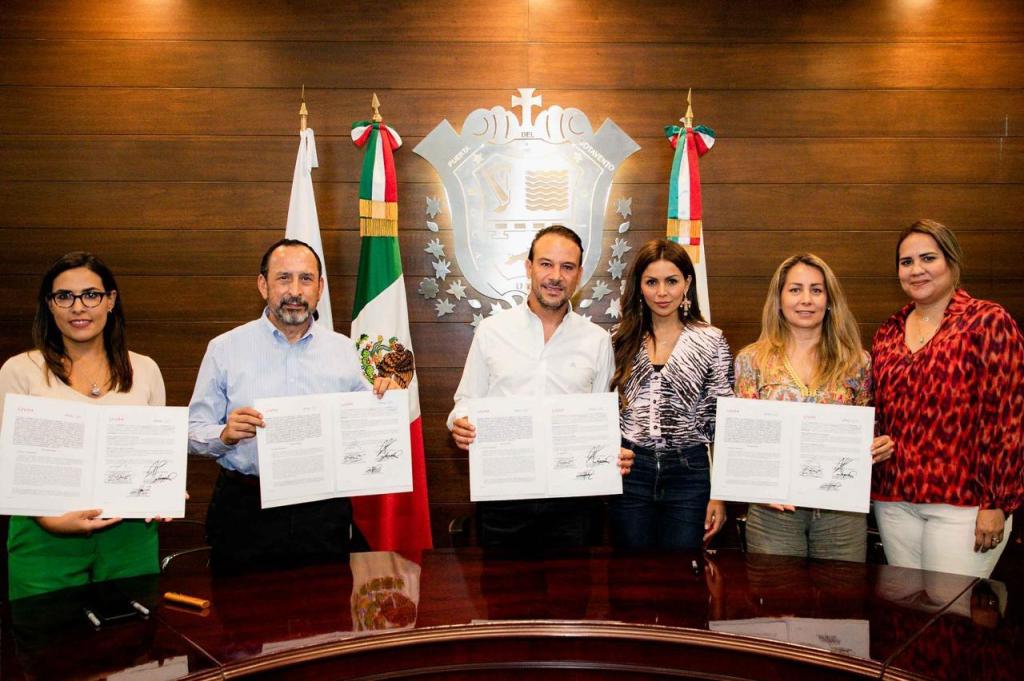 Para atestiguar la firma del convenio interinstitucional, estuvo presente la Presidenta del DIF Municipal, Melina Rivera de Unánue.