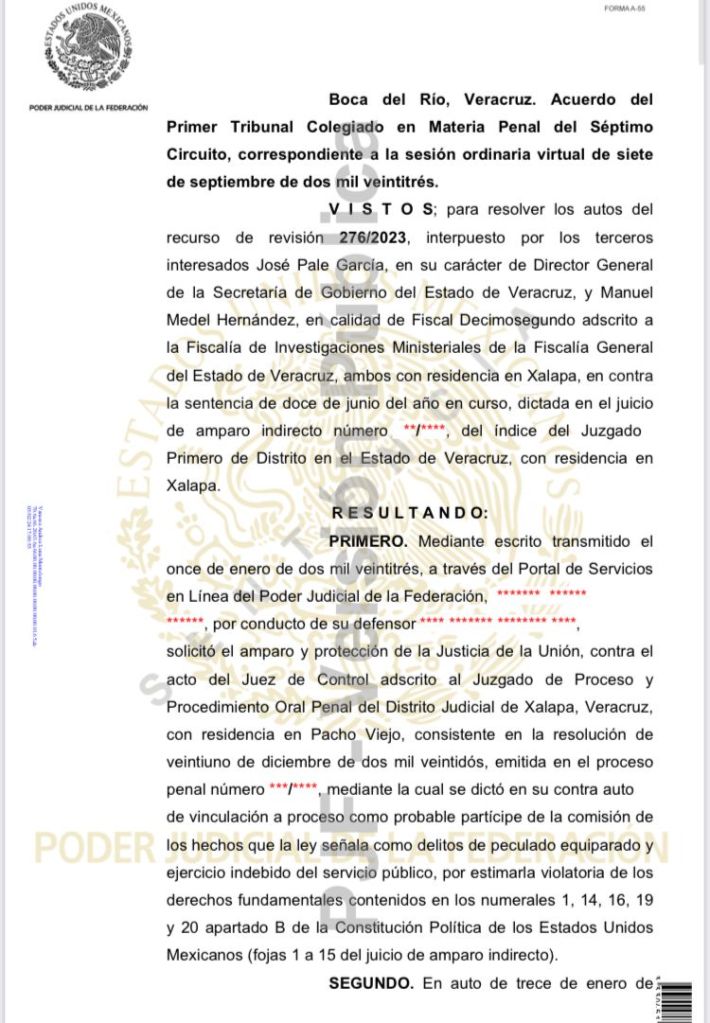 1) Dejará insubsistente la resolución del veintiuno de diciembre de dos mil veintidós, en la cual decretó auto de vinculación a proceso, por los delitos de peculado equiparado y ejercicio indebido del servicio público; y,
