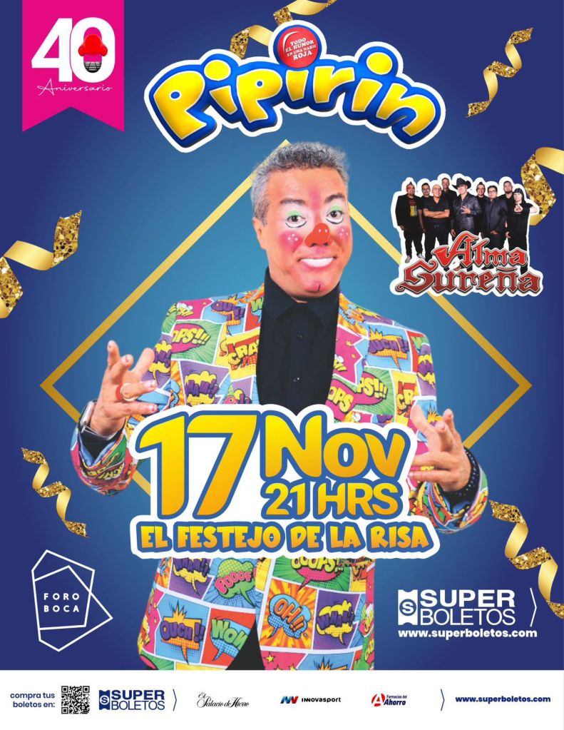 Boca del Río, Veracruz. Septiembre 2023.- Para celebrar 40 años de carrera artística, el payaso PIPIRÍN ofrecerá tremendo show en el Foro Boca el próximo viernes 17 de noviembre teniendo como invitado especial al Grupo Alma Sureña.