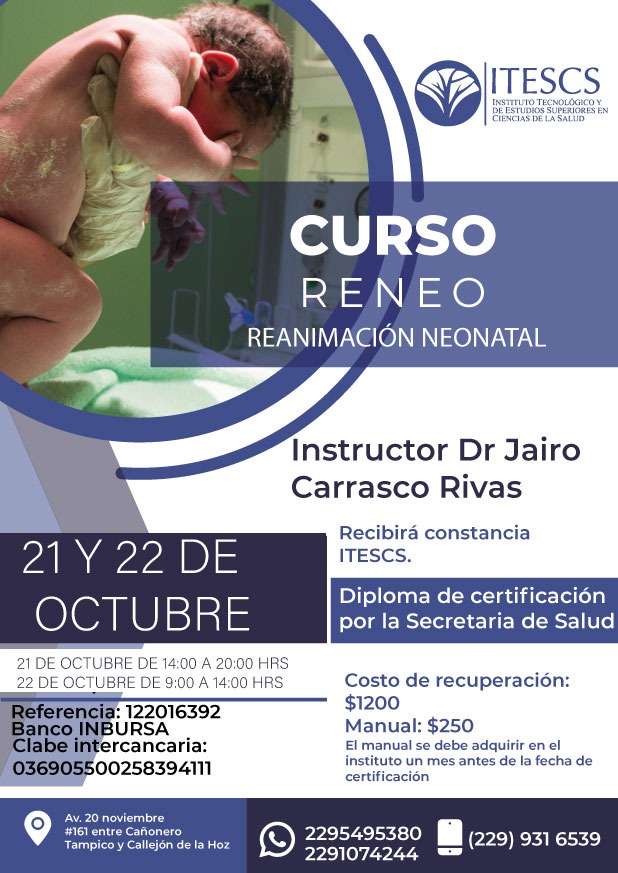 El Instituto Tecnológico y de Estudios Superiores en Ciencias de la Salud (ITESCS), invita al personal de salud al curso de Reanimación Neonatal (RENEO), que se llevará a cabo el 21 y 22 de octubre en dichas instalaciones.