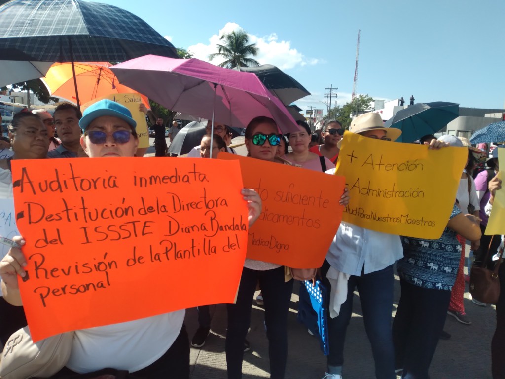 Un grupo de derechohabientes ,principalmente maestros se manifestaron en la clínica del Issste en.la ciudad y puerto de Veracruz para exigir al Gobierno resuelva los problemas que se están presentando en los servicios.