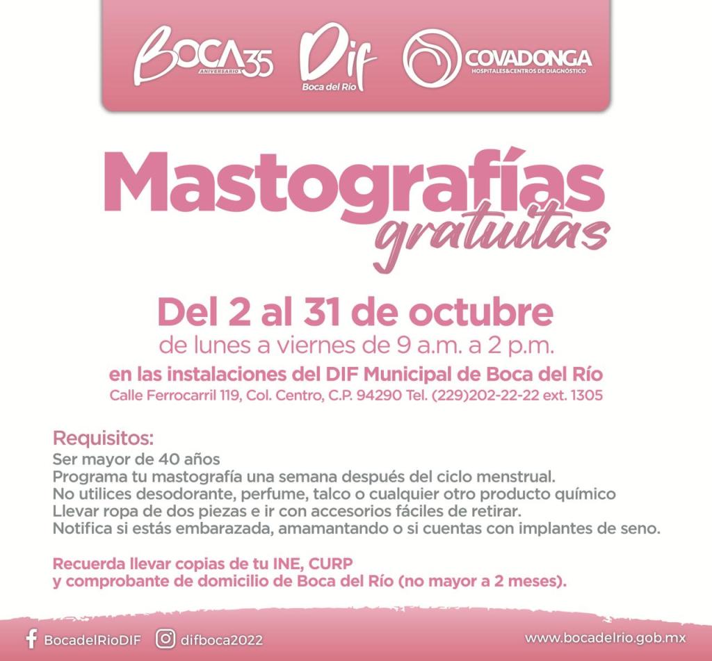Las mastografías gratuitas se realizarán de lunes a viernes de 9 a.m. a 2 p.m. Las boqueñas mayores de 40 años deberán acudir a las instalaciones del DIF municipal ubicadas en calle Ferrocarril #119 entre Av. Veracruz y bulevar Vicente Fox.