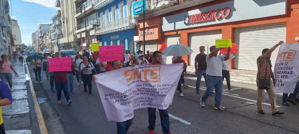 Veracruz, Ver.- Maestros que mantenían un paro desde hace 10 días marcharon por el centro de la ciudad de Veracruz en protesta por la falta de solución a la denuncia en contra del Supervisor Escolar 021-A zona Veracruz en Telesecundarias; a quién acusan de acoso sexual, acoso laboral, entre otros delitos.