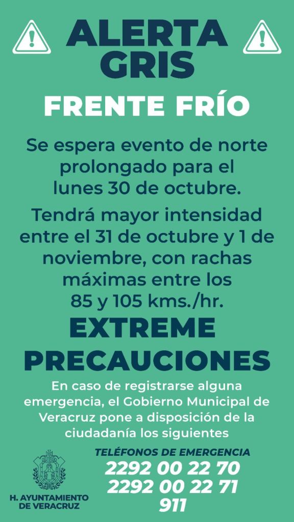 *Veracruz, Ver., 27 de octubre de 2023.-* El Gobierno Municipal de Veracruz, a través de la Subdirección de Estudios y Pronósticos Meteorológicos de la Secretaría de Protección Civil de Veracruz, informa sobre la Alerta Gris por la entrada del Frente Frío (probable No. 8) en el Puerto de Veracruz.