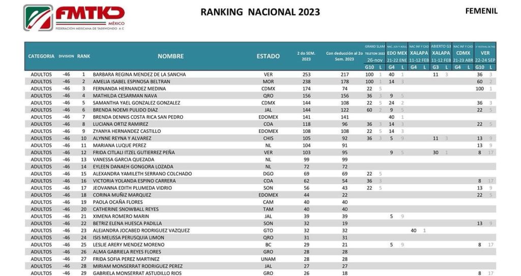 La Federación Mexicana de Taekwondo reveló el Ranking Nacional en donde Méndez de la Sancha es líder en la categoría Adultos menos 46 kilogramos femenil superando a la morelense Amelia Espinosa y a la distritense, Fernanda Hernández.