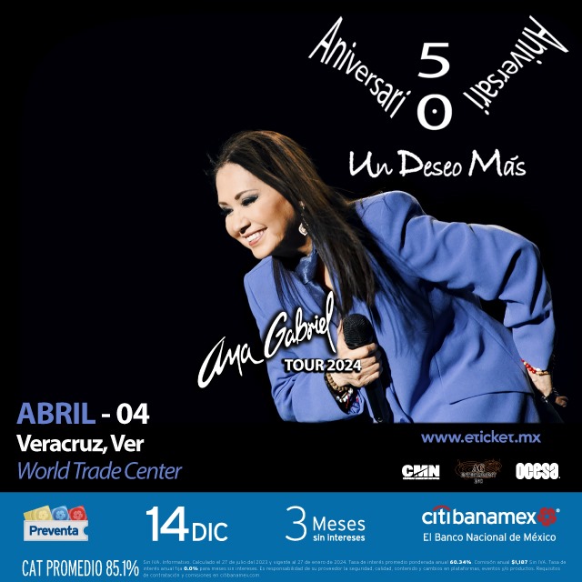 No te puedes perder el deleite de disfrutar de este gran concierto de Ana Gabriel en Veracruz el jueves 4 de abril en el WTC.
