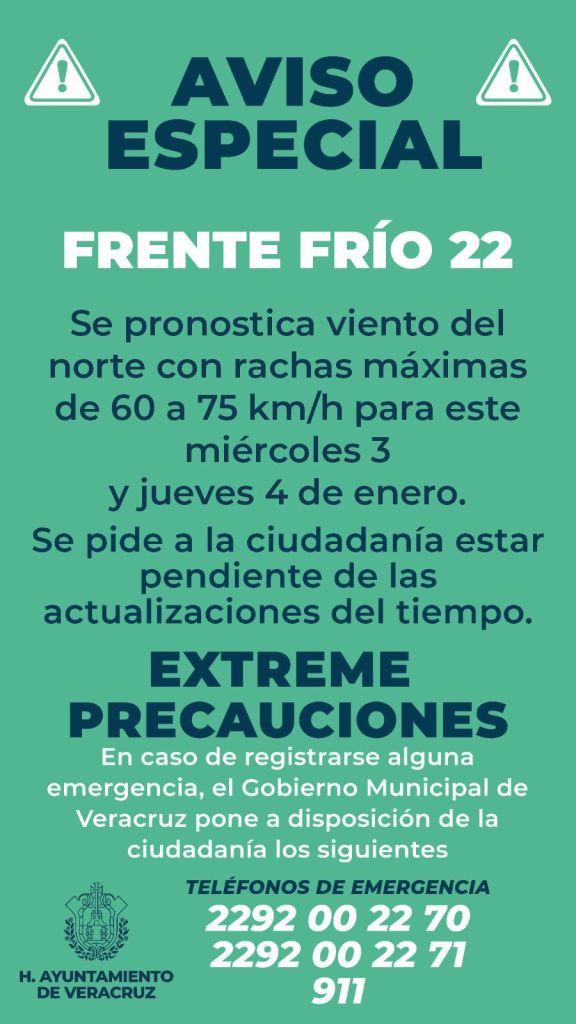 *Veracruz, Ver., 28 de diciembre de 2023.-* El Gobierno Municipal de Veracruz, a través de la Unidad de Protección Civil, emite un aviso especial por la entrada del Frente Frío No. 22 en el puerto de Veracruz.