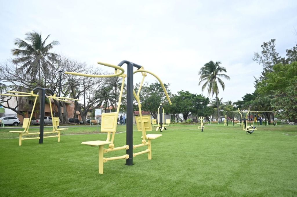Así también, se construyeron dos zonas con aparatos para realizar ejercicios, en donde se colocó también pasto sintético; se construyeron nuevos andadores y rampas, piso de adoquín, nuevas bancas y botes de basura.