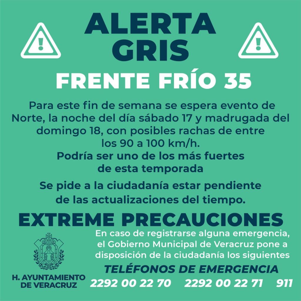 *Veracruz, Ver., 16 de febrero de 2024.-* El Gobierno Municipal de Veracruz, a través de la Unidad de Protección Civil, informa sobre la Alerta Gris por la entrada del probable Frente Frío No. 35 al puerto de Veracruz.