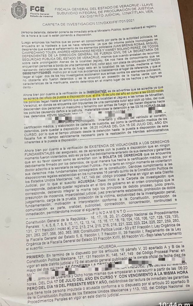 En la caseta de Acayucan, la intercepta la Fuerza Civil, y sin razón alguna la detiene a ella, a su hermano y a sus menores hijos y de allí la trasladan a una instalación policial y la torturan a ella y a su hermano casi hasta la muerte, provocando lesiones múltiples, como estallamiento de estómago, hematomas en todo el cuerpo, una lesión de columna y, al día siguiente, 17 de Julio los oficiales de Fuerza Civil “inventan” la historia de que ella y su hermano atacan a los policías en un paraje desolado de Minatitlán y la ponen a disposición del Fiscal 6 de Minatitlán, en ese momento Ángel Isidro Luis , es quien inicia la supuesta carpeta de investigación MIN/DXXI/F6/701/2021.
