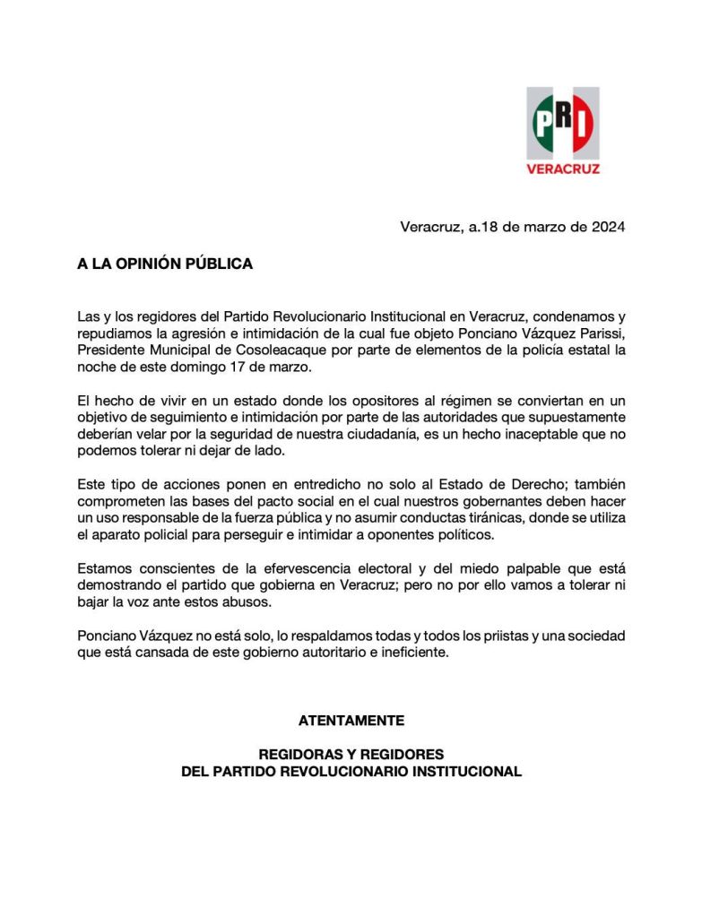 Veracruz, Ver.- En documento enviado a medios de comunicación, regidoras y regidores del PRI en Veracruz, condenaron y repudiaron la agresión e intimidación de la cual fue objeto, Ponciano Vázquez Parissi, alcalde de Cosoleacaque, por parte de elementos de la Policía Estatal la noche de este domingo 17 de marzo.