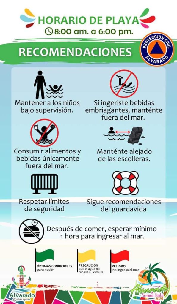 Alvarado, Ver.- La Dirección de Protección Civil del municipio de Alvarado, en coordinación con SEMAR, SEDENA y Seguridad Pública, dió a conocer una serie de recomendaciones a turistas, para disfrutar de este periodo vacacional en la zona de playas.