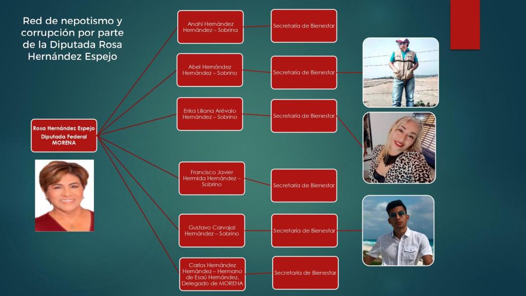 También figuran sobrinos de la candidata Rosa María Hernández Espejo, estos son: Anahí, Abel, Erika, Francisco, Gustavo, y Carlos; todos ellos cobran en la Secretaría de Bienestar.