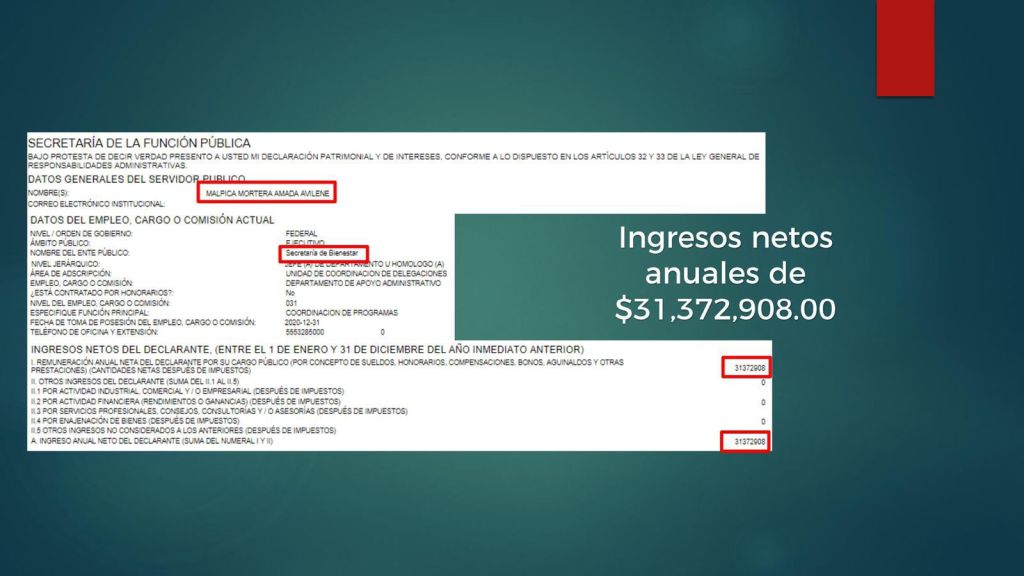 Otro ejemplo, dijo, es Amada, quien está vinculada a otro integrante de su familia, y que en su declaración patrimonial 2022 refiere ingresos por más de 31 millones de pesos. “Tuvo un ingreso mensual de más de 3 millones; al año, 31 millones”, dijo.
