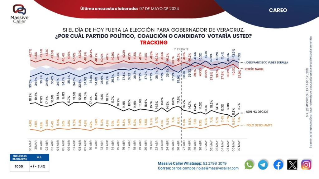 En particular, la última encuesta de Massive Caller, realizada el 7 de mayo, posiciona a Pepe Yunes con un 41.3% de la intención de voto, superando a Rocío Nahle de Morena, quien alcanza un 37.9%, y a Polo Deschamps de Movimiento Ciudadano, con un 7.1%.