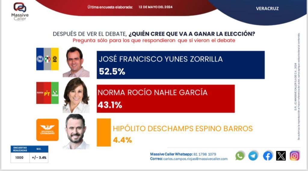 Massive Caller reveló que el 52.7% de los espectadores consideró que Yunes presentó las mejores propuestas y fue el ganador del debate, superando a Rocío Nahle, quien obtuvo un 40.5%, y a Polo Deschamps con un 6.8%. Adicionalmente, un 52.5% de los encuestados manifestó confianza en la victoria de Yunes en las próximas elecciones, frente a un 43.1% que apoyó a Nahle y un 4.4% a Deschamps.