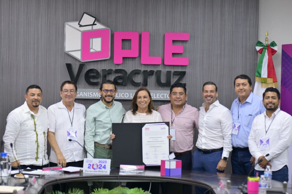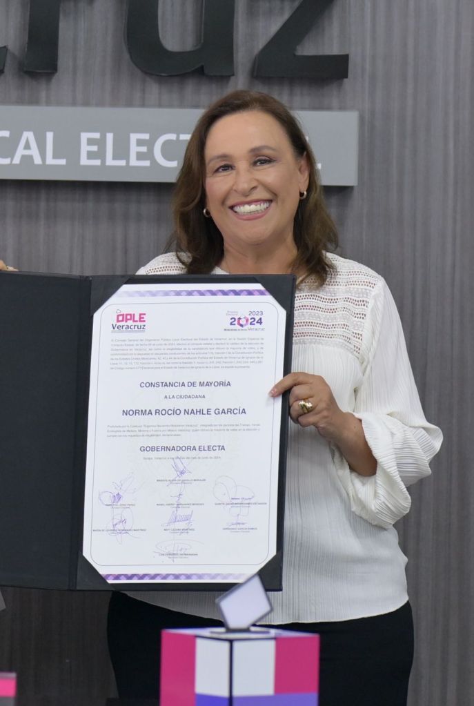 Xalapa, Ver., domingo 09 de junio de 2024.- En Sesión Especial, el Consejo General del Organismo Público Local Electoral (OPLE), entregó la constancia de mayoría a la gobernadora electa de Veracruz, Rocío Nahle García.