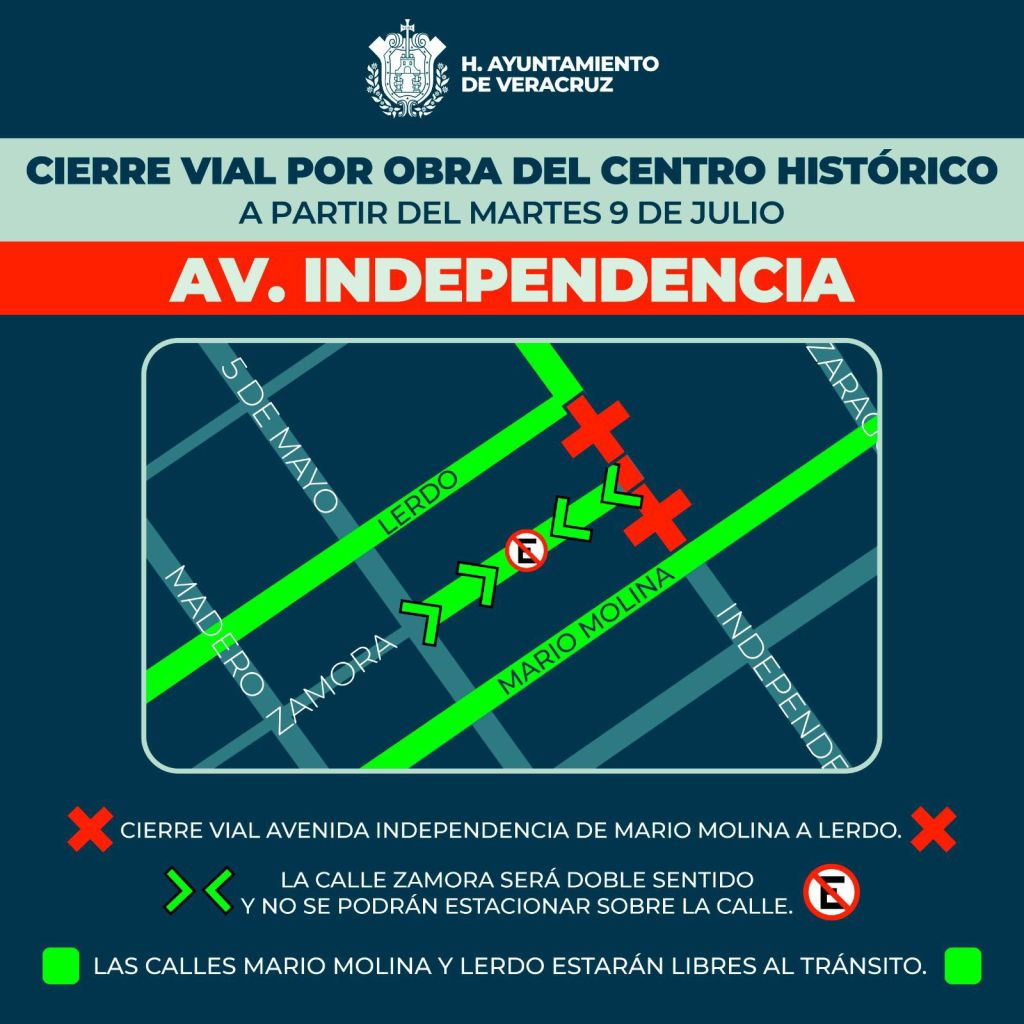 *Veracruz, Ver., 05 de julio de 2024.-* El Ayuntamiento de Veracruz informa que, por la realización de obras en el Centro Histórico de la ciudad, a partir del día martes 9 de julio, habrá cierre vial en la avenida Independencia, en el tramo comprendido entre la calle Mario Molina y Miguel Lerdo de Tejada, permaneciendo cerrado hasta que concluya la obra.