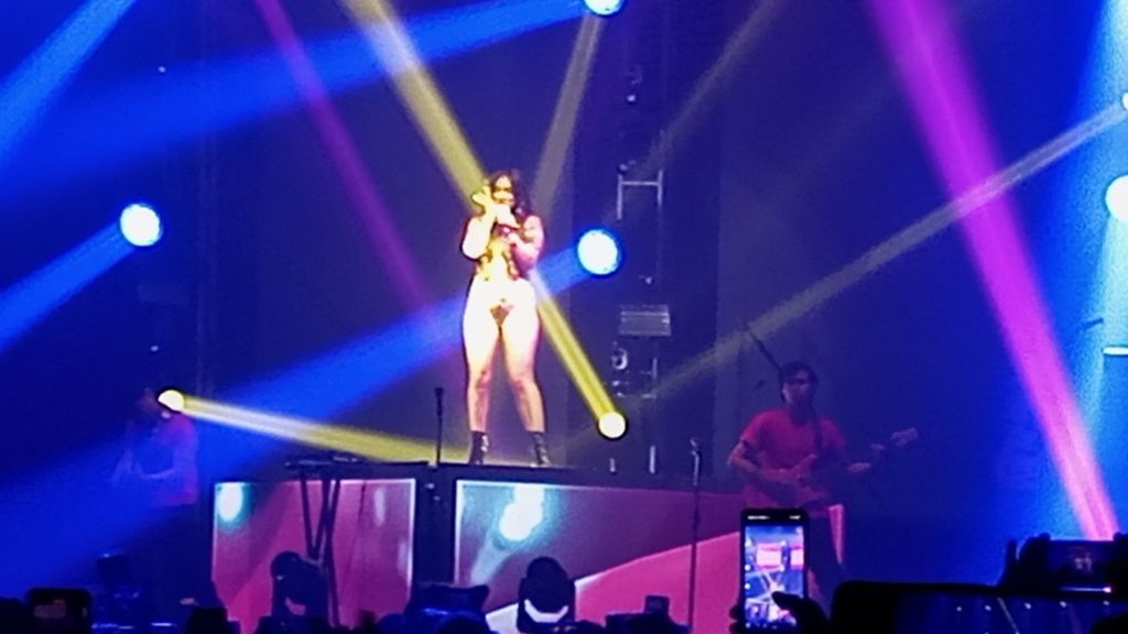 La cantante salió al escenario en medio de gritos de su público veracruzano,con un vestido multicolor iniciando con sus temas como “Tal vez” así como su colaboración con Leo Rizzi,Malvas entre otras y poniendo a cantar a todos con Goma de mascar, Clavo que saca otro clavo.