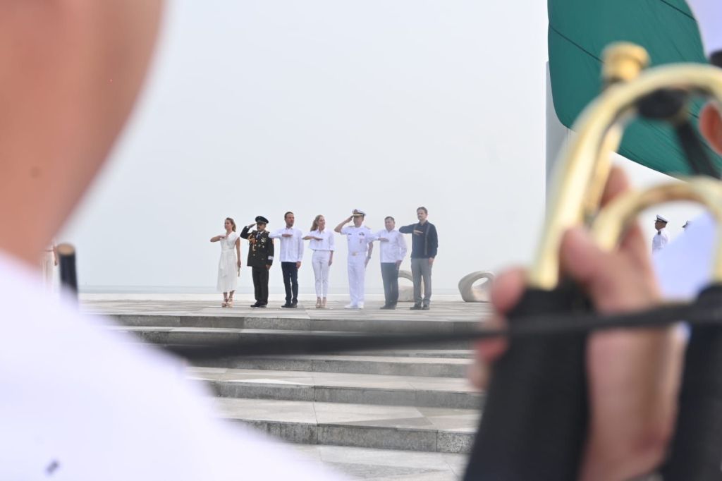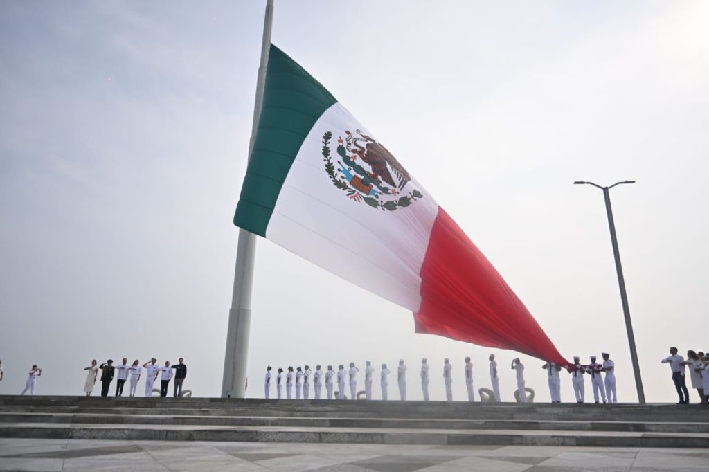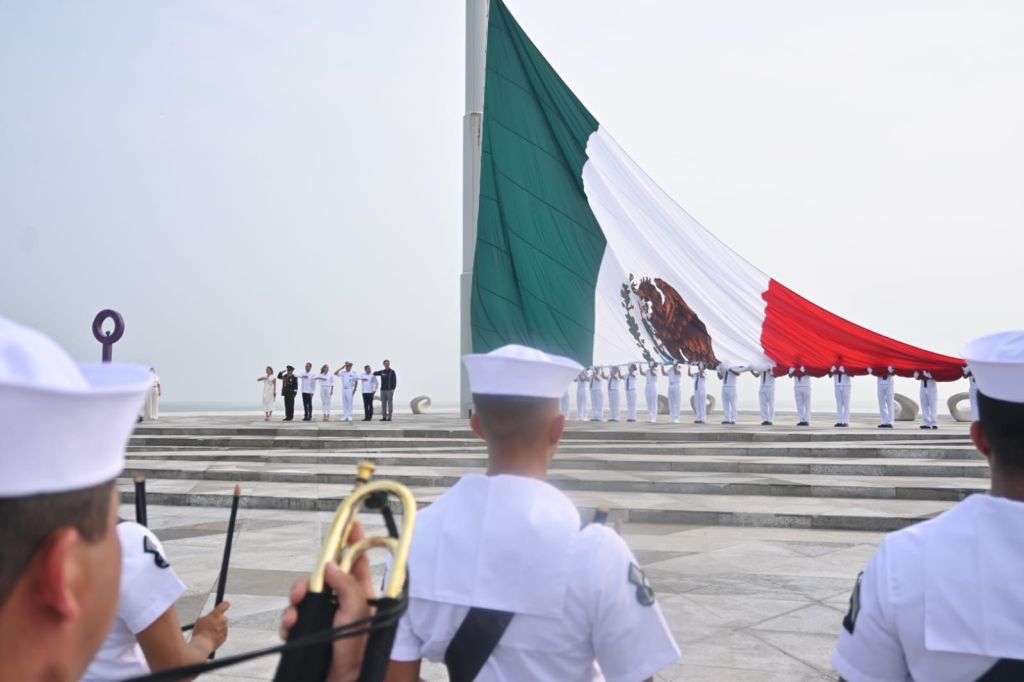 El acto cívico dio inicio con los Honores al Lábaro Patrio, seguido del izado de la Bandera Monumental por parte de elementos de la Tercera Región Naval.