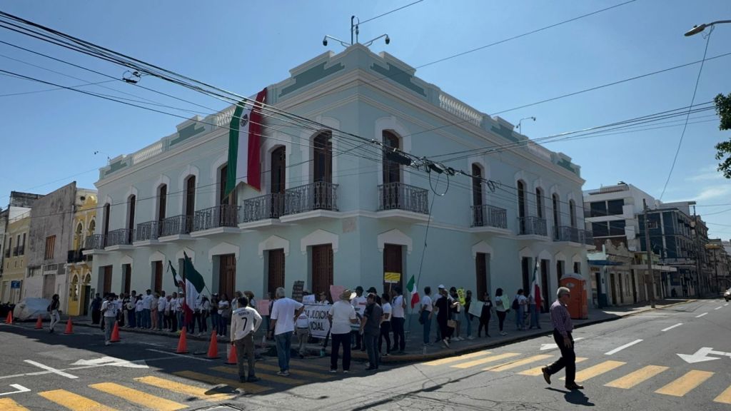 Trabajadores del Poder Judicial de la Federación se reunieron afuera del Museo Benito Juárez en Veracruz para expresar su desacuerdo con la reciente aprobación de la reforma judicial.