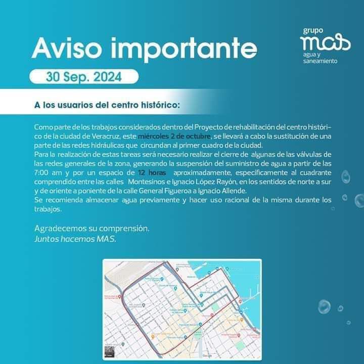 Mañana miércoles, el suministro de agua será suspendido en el centro de Veracruz debido a un cambio en la red hidráulica que forma parte de los trabajos de rehabilitación del sistema de agua potable y drenaje del centro histórico.