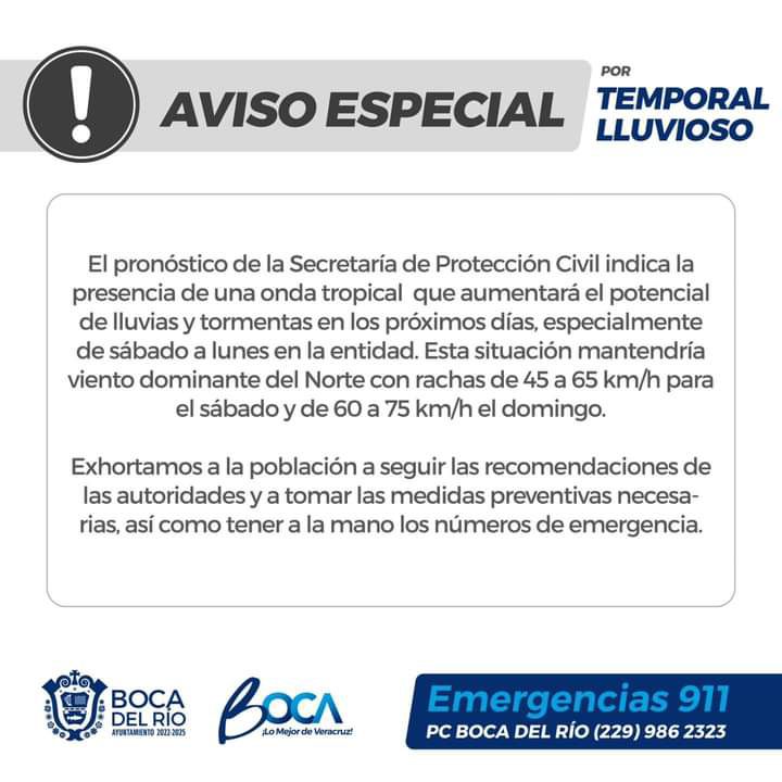 El pronóstico de la Secretaría de Protección Civil indica la presencia de una onda tropical que aumentará el potencial de lluvias y tormentas en los próximos días, especialmente de sábado a lunes en la entidad. Esta situación mantendría viento dominante del Norte con rachas de 45 a 65 km/h para el sábado y de 60 a 75 km/h el domingo.