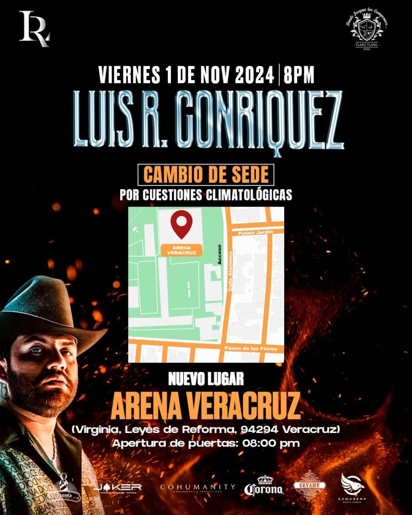 *Boca del Río, Veracruz. 24 de Octubre 2024.-* La producción del concierto del cantante Luis R Conriquez informa que con la finalidad de dar plena seguridad a los asistentes ante el pronóstico de lluvia, el concierto cambia de sede, por lo que se realizará en la ARENA VERACRUZ, mismo día y misma hora.