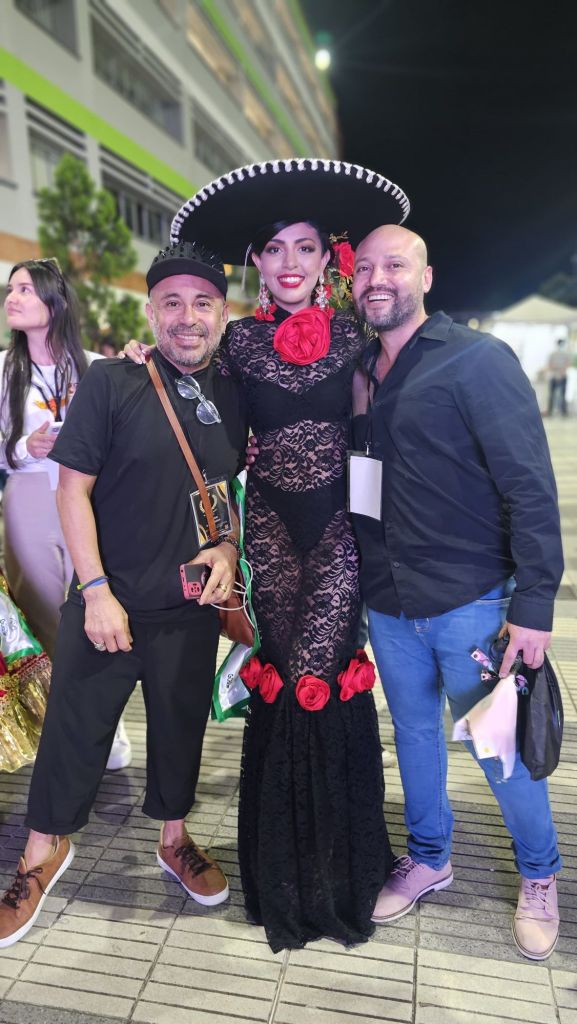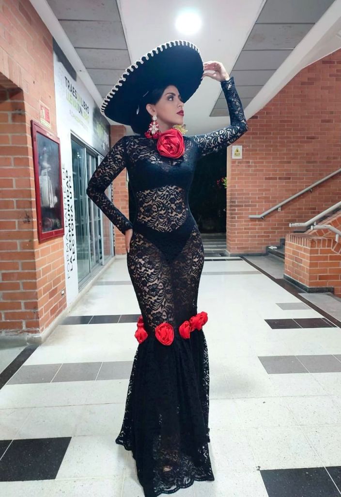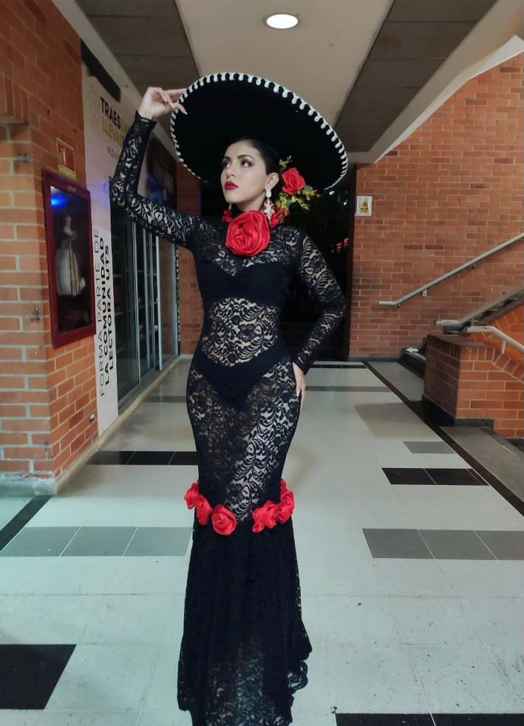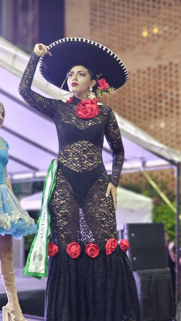 El traje típico estilizado «Mexicana de Corazón/Amor a la Mexicana» está confeccionado en encaje italiano con rosas rojas en relieve en tefetán rojo y como accesorio principal el Sombrero de Charro, perteneciente a la longeva colección del Ballet Tradiciones de México.