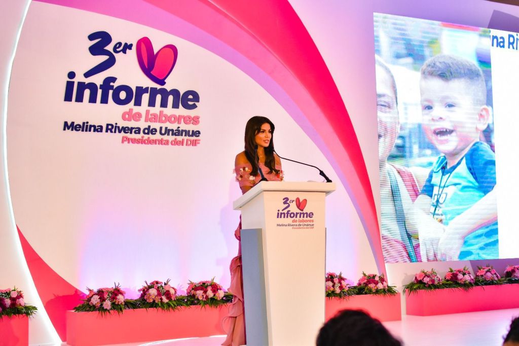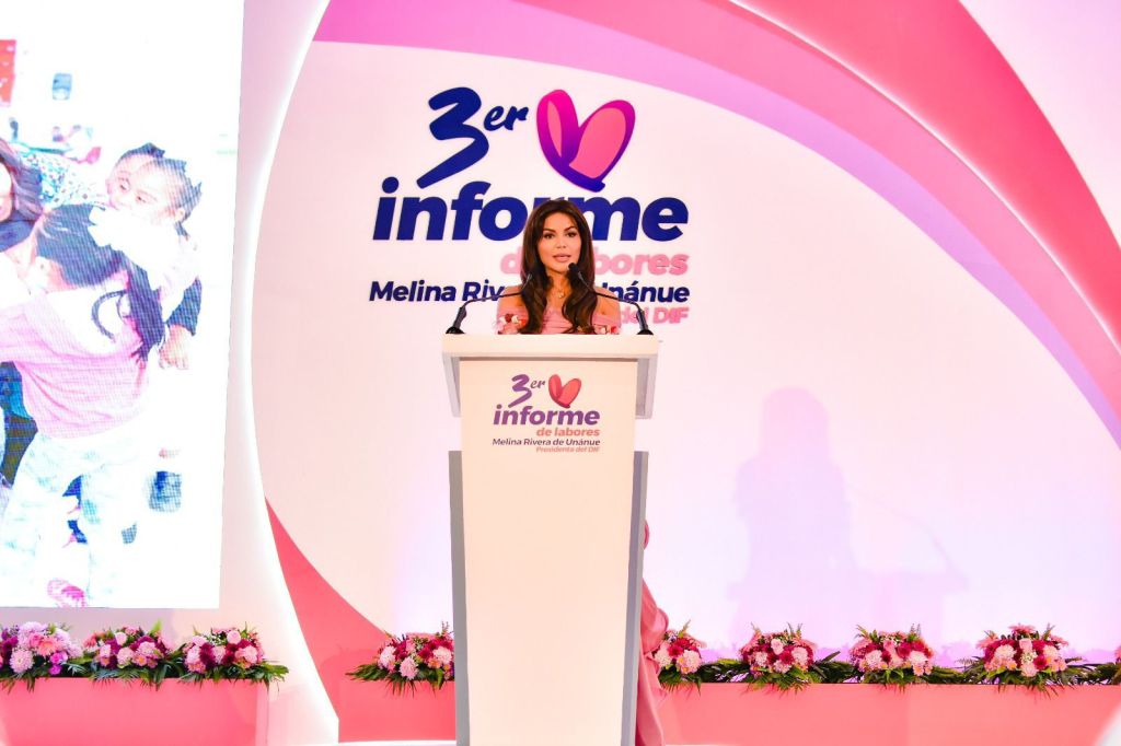 Rivera de Unánue reconoció importantes logros, como la atención integral a la infancia a través de los centros asistenciales CADIS y CAICS, festivales, campañas de salud y donativos entregados a diversas asociaciones que apoyan a niñas y niños vulnerables.