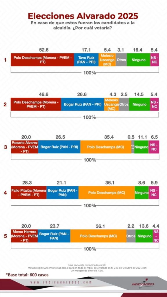 Según la medición realizada por dicha empresa encuestadora, Polo Deschamps como candidato de la coalición Morena, Verde, PT, ganaría la alcaldía de Alvarado con el 52.6 por ciento de la votación, seguido por el candidato de la alianza PAN/PRI, Tavo Ruiz, con el 17.1 por ciento de los votos. En tercer lugar se ubicaría Melesio Uscanga con el 5.4 por ciento de la votación.