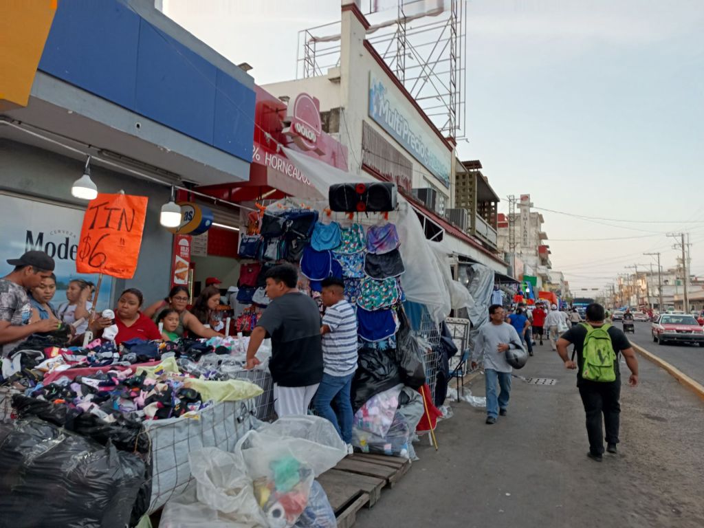 En la zona de mercados y principalmente en la calle Hidalgo entre Cortés y Juan Soto,las personas caminan de prisa,apuradas con bolsas en las manos para celebrar el año nuevo,todo es normal y no hay nada fuera de lo común,se escucha el ruidos de los camiones,los vendedores ofertando sus productos y largas filas en comercios.