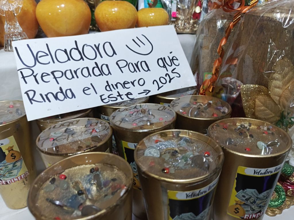 “Ahorita lo que más se está vendiendo son las imágenes de la Santa Muerte, y la esfera navideña que es una veladora y esa se prende cada inicio de año para atraer la buena suerte y la abundancia”, señaló Giovani.