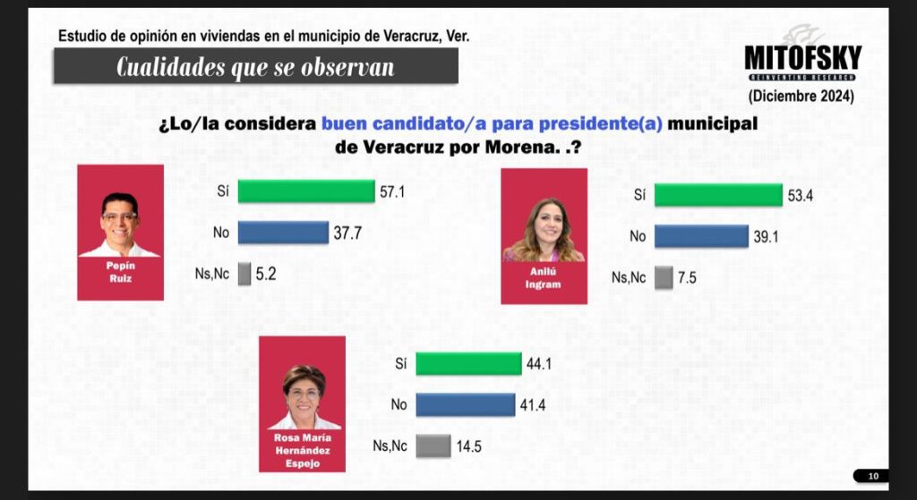 Veracruz, Ver., a 2 de enero del 2025.- De acuerdo a una medición hecha por la empresa encuestadora de Roy Campos, Mitofsky, la mujer aspirante más fuerte de Morena es Anilú Ingram quien ante la pregunta de ¿la considera buena candidata para presidenta municipal de Veracruz por Morena?, obtiene el 53.4 por ciento de las preferencias, contra el 44.1 que logra la diputada federal Rosa María Hernández Espejo.
