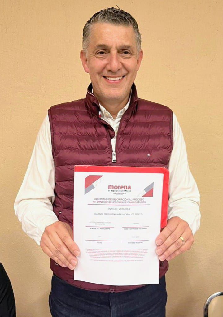Fortín, Ver. – El profesor Víctor Vargas, acompañado de su familia y con el folio de registro en mano, dio un paso firme hacia la contienda electoral al presentar su constancia como aspirante a la candidatura de MORENA para la presidencia municipal de Fortín.