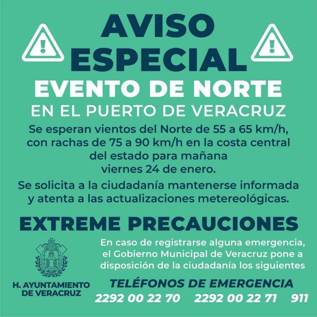 *Veracruz, Ver., 23 de enero de 2025.*– El Gobierno Municipal de Veracruz, a través de la Unidad de Protección Civil, informa sobre el Aviso Especial ante el evento de Norte previsto para mañana, viernes 24 de enero, en el Puerto de Veracruz.