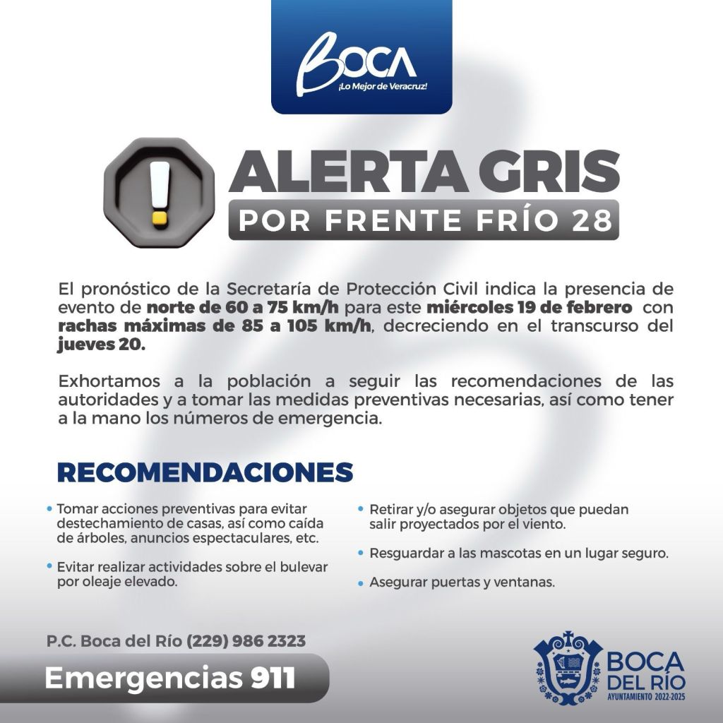 Ante el impacto del Frente Frío 28 y sus efectos en la ciudad de Boca del Río, el alcalde de Boca del Río, Juan Manuel Unánue Abascal, ha ordenado la implementación de un operativo previo-durante y después del fuerte viento del norte que se registrará a partir de este miércoles 19 de enero.