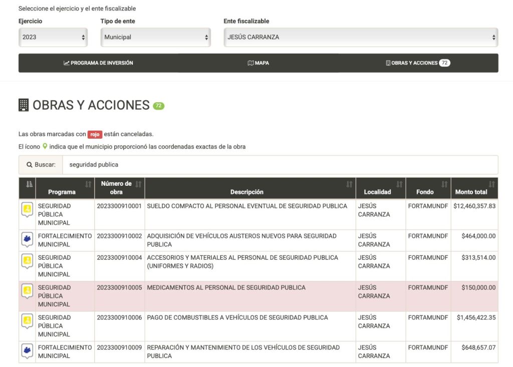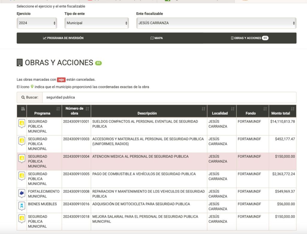 Sin embargo, el Sistema de Consulta de Obras y Acciones Municipales del ORFIS, que documenta las inversiones que hacen los ayuntamientos con información que proporcionan los mismos municipios, dice que durante 2024 y 2023 Jesús Carranza destinó 26 millones de pesos tan solo a salario de elementos de la Policía Municipal.