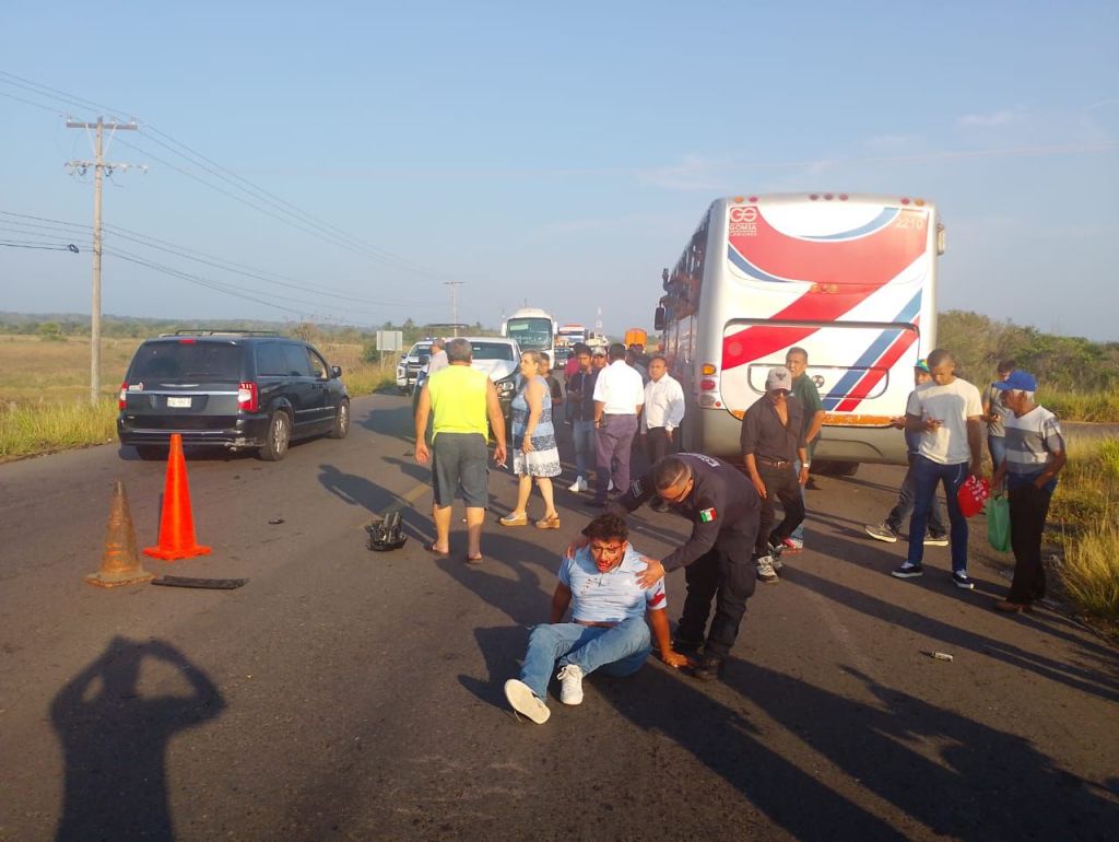 El motociclista tuvo la mala fortuna de chocar con un autobús de pasaje Los Tuxtlas, dejando su unidad debajo de la llanta del autobús; al sitio acudió la Unidad Médica de Protección Civil de Alvarado, la cual y atención al joven que presentaba fractura de tobillo con exposición y hemorragia activa, además de contusión frontal, todo esto en su lado izquierdo.