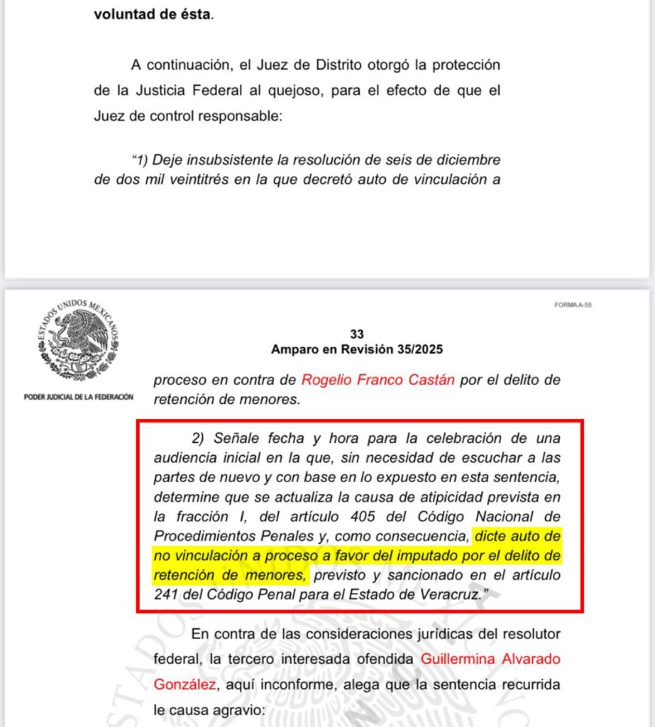 Confirma Tribunal Colegiado sentencia amparadora que anula el proceso penal por el delito de retención de menores impuesto a Rogelio Franco Castán. Con esta resolución Rogelio quedará en libertad total, último de 11 delitos (entre otros ultrajes a la autoridad, peculado equiparado, ejercicio indebido del servicio público, contra la administración de justicia, abuso de autoridad) que le impusieron prisión preventiva justificada y en particular por el delito por retención de menores, resguardo domiciliario desde agosto de 2023.