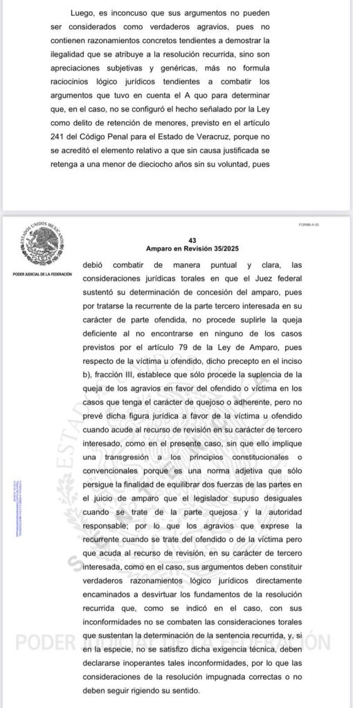 Dentro de los considerandos de la sentencia recaída al amparo en revisión, constan los razonamientos por los cuales se desecha el recurso de revisión interpuesto por la madre de la menor en calidad de tercera interesada, al considerar sus argumentos inoperantes y no encontrarse bajo ningún supuesto del articulo 79 de la ley de amparo, la resolución indica que el juez de control no estimó pruebas ofrecidas por la defensa de Rogelio Franco, se negó analizar constancias de un expediente civil, omitió revisar dictamen psicológico de su menor hija; contrario a lo que lo que se dijo, el tribunal no advirtió que Rogelio tuviera limitada guarda y custodia por alguna autoridad.
