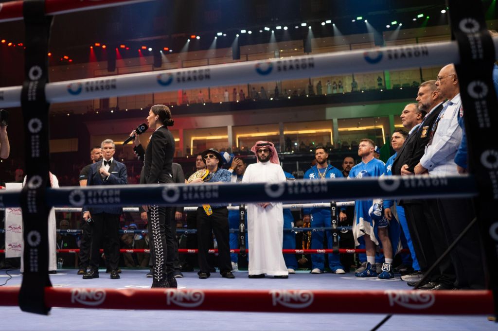 – Bajo las brillantes luces y el rugiente público, la artista de música mexicana Majo Aguilar se destacó al ofrecer una poderosa e inolvidable interpretación del himno nacional en la esperada pelea de boxeo protagonizada por el dos veces campeón indiscutido del peso supermediano, el boxeador más icónico de México y la cara del boxeo, Saúl “Canelo” Álvarez. Su actuación cautivó a miles de personas en el estadio y a millones de espectadores en todo el mundo, llevando con orgullo su herencia mexicana al escenario mundial en Riad, Arabia Saudita. Fue un momento decisivo que no sólo honró sus raíces, sino que también consolidó su lugar como una figura emergente en la música mexicana.